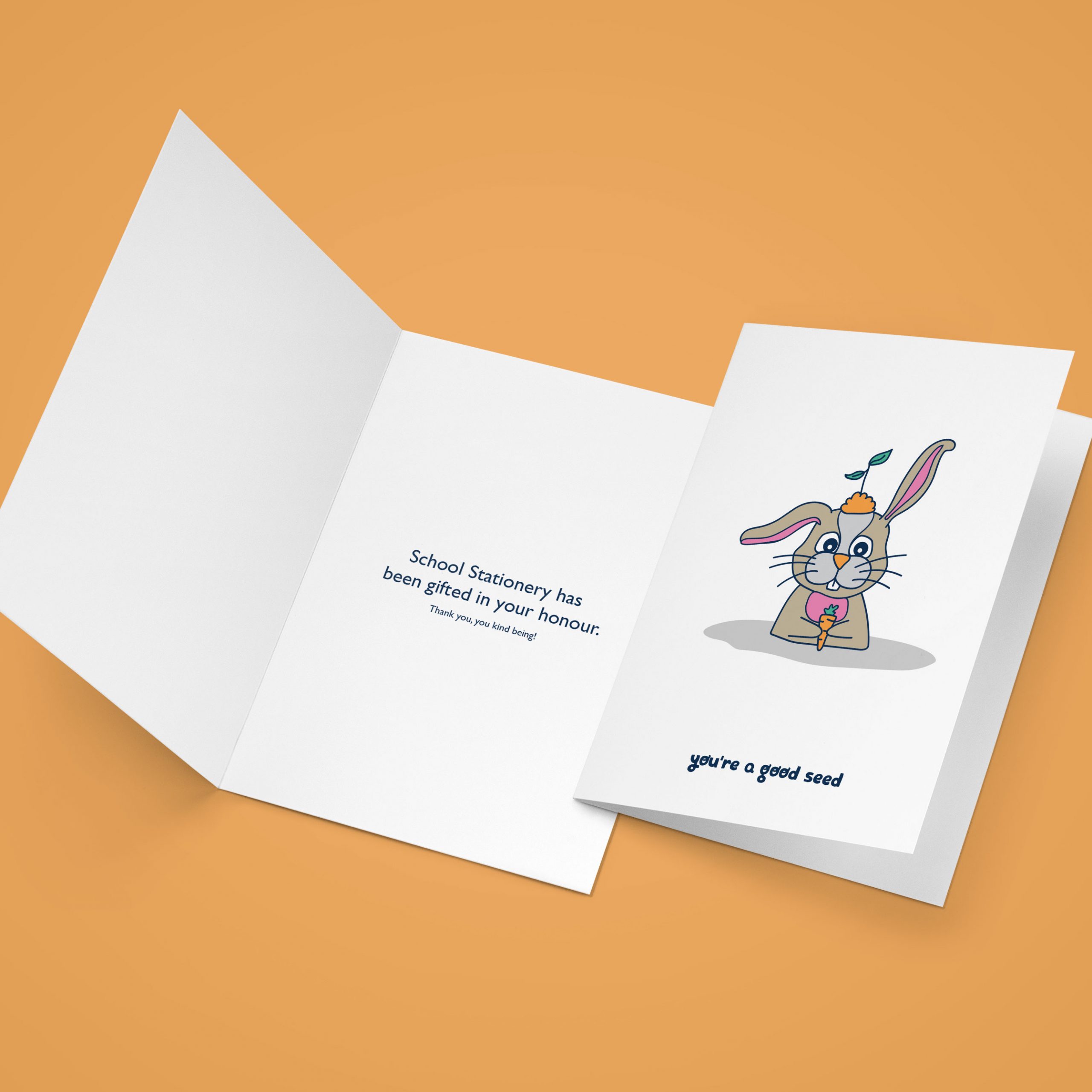 Inside message reads “School Stationery has been gifted in your honour. Thank you, you kind being!”