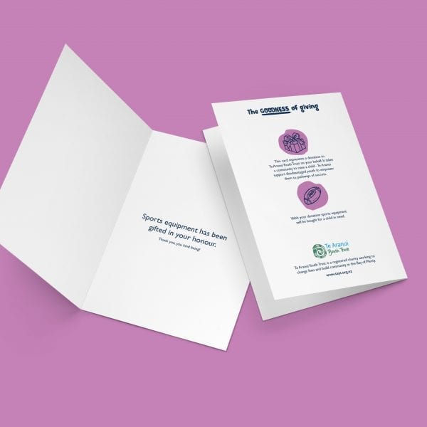 This downloadable e-card represents a donation to Te Aranui Youth Trust on your behalf. With your donation sports equipment will be bought for a child in need.